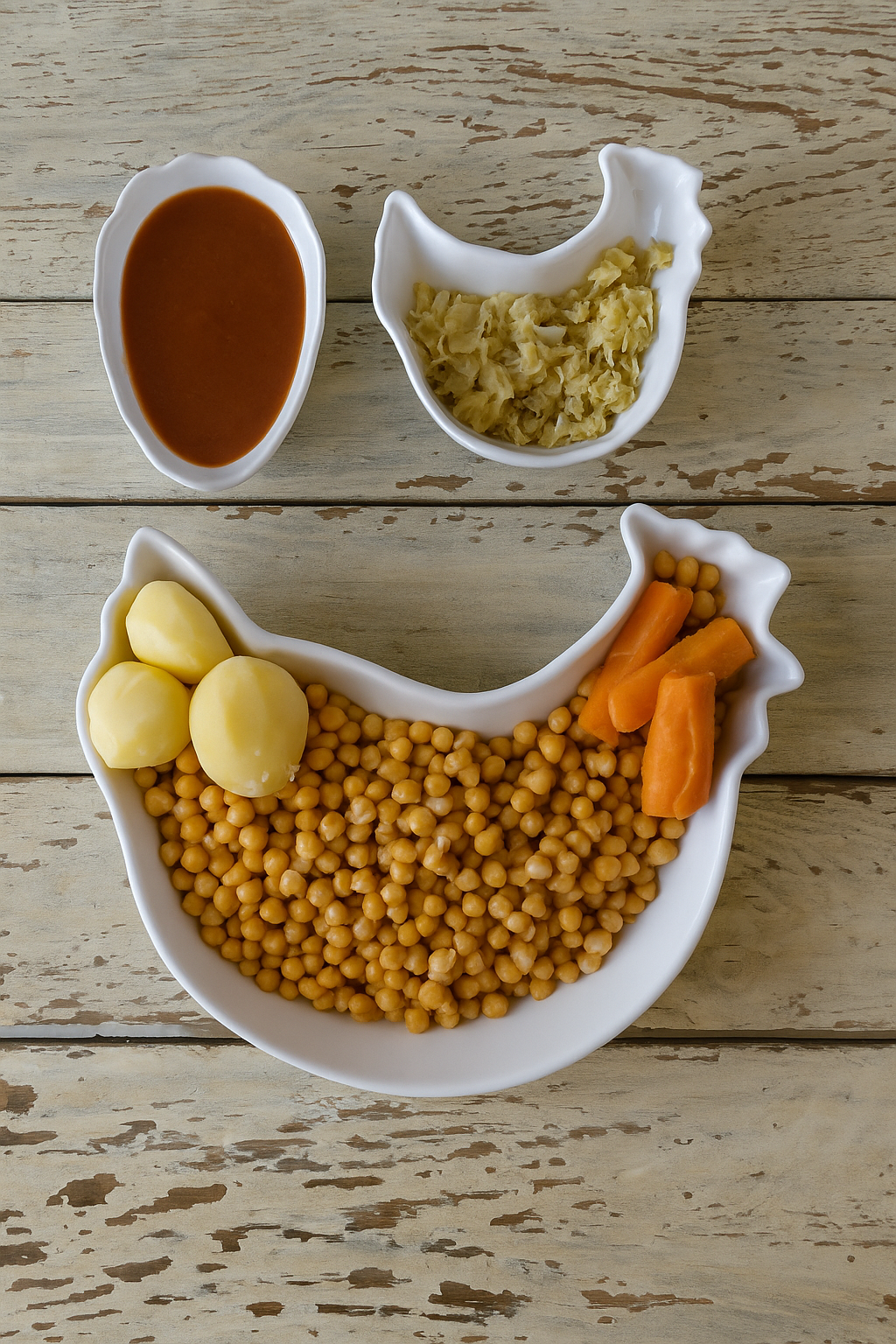 Elaborado al modo clásico, en tres vuelcos, el cocido combina una sopa de fideos clara e intensa, garbanzos pedrosillanos de Toledo con repollo y salsa cominera, y una pringá compuesta por chorizo, tocino, morcilla, pollo, morcillo y punta de jamón.