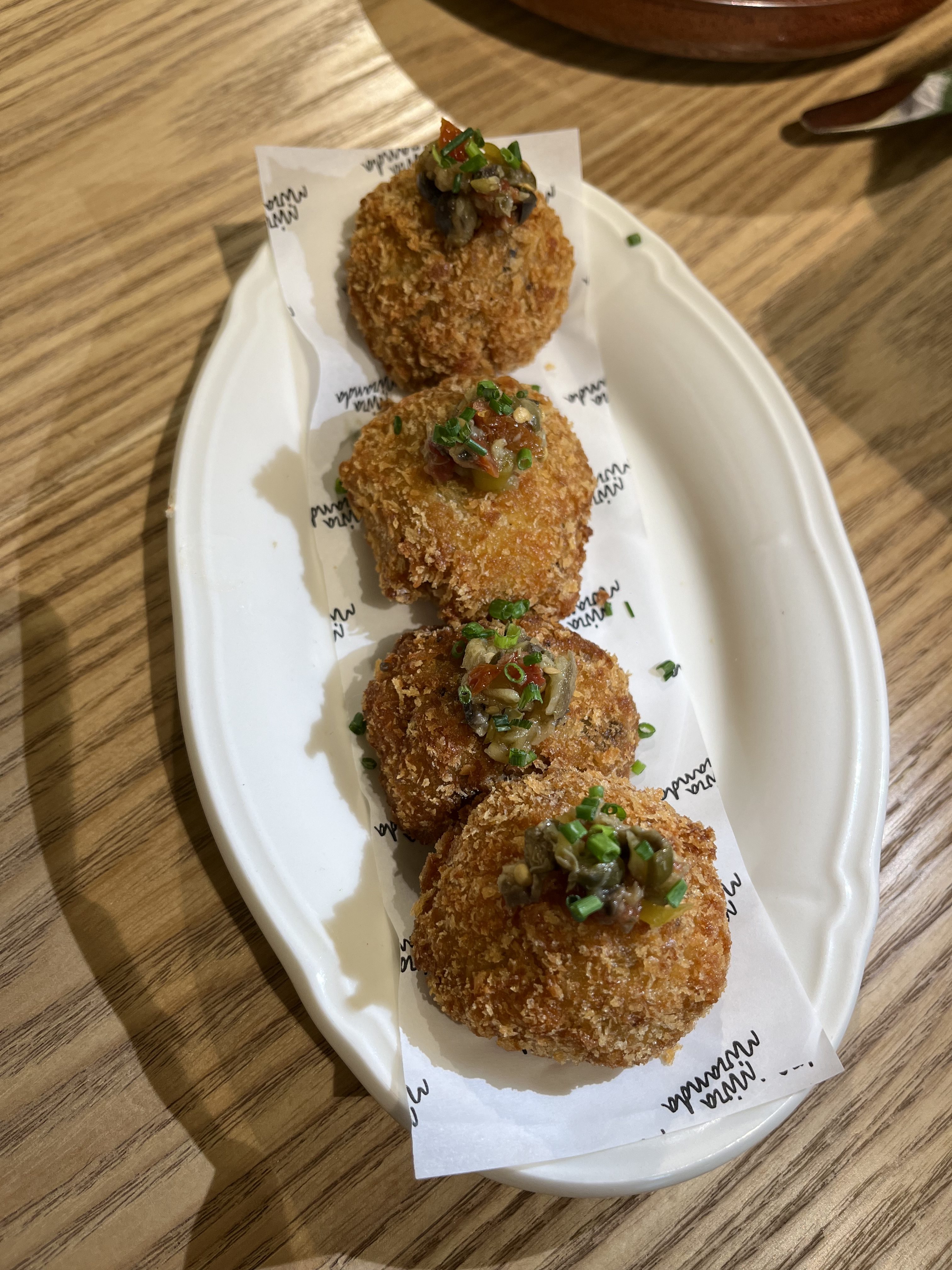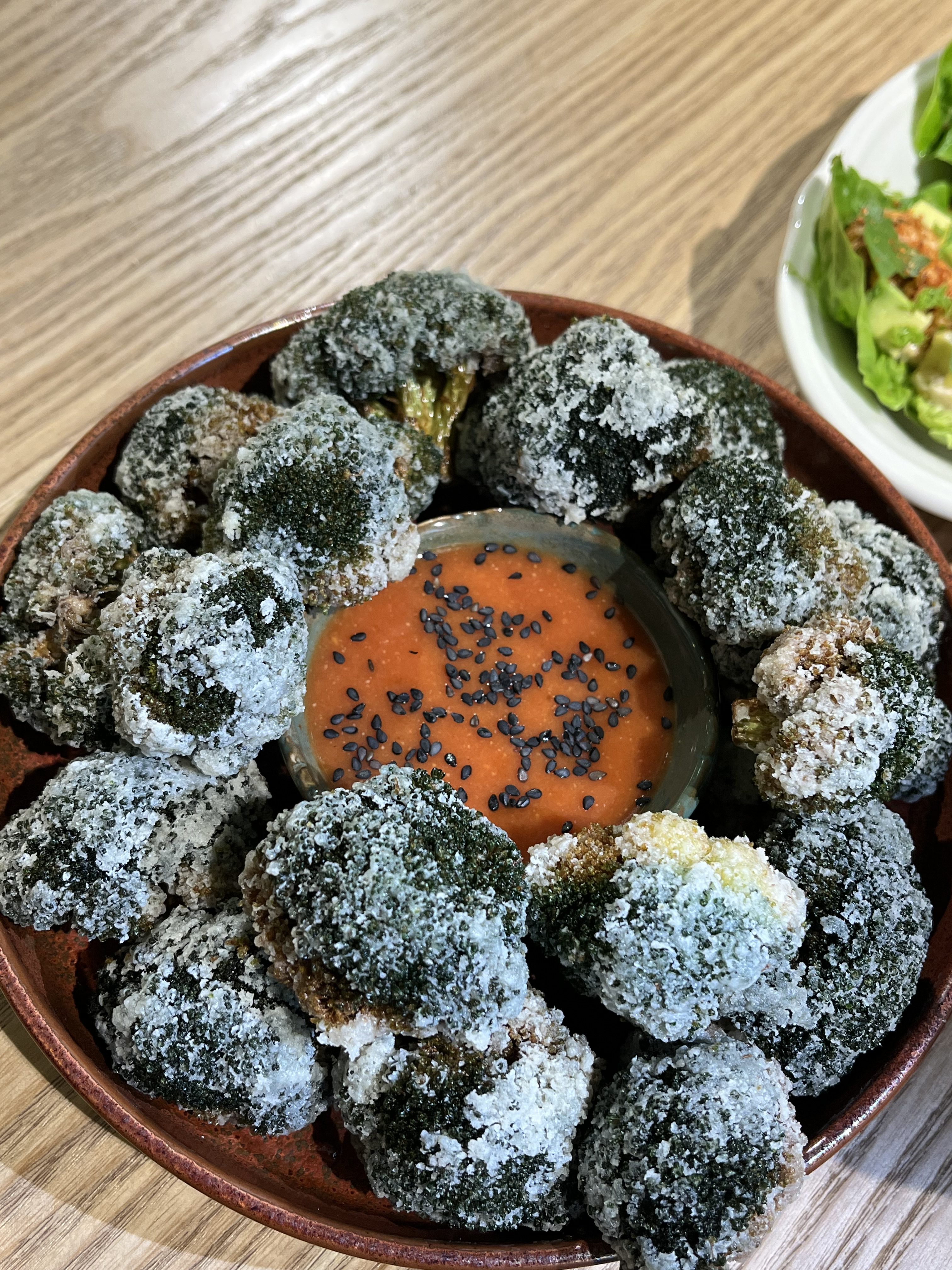 Entre los platos estrella de Mira Miran cabe destacar sus súper Green bravas: brócoli tempurizado con su icónica salsa brava. Se trata de una versión inesperada del brócoli que te aseguro que gustará a todo el mundo.