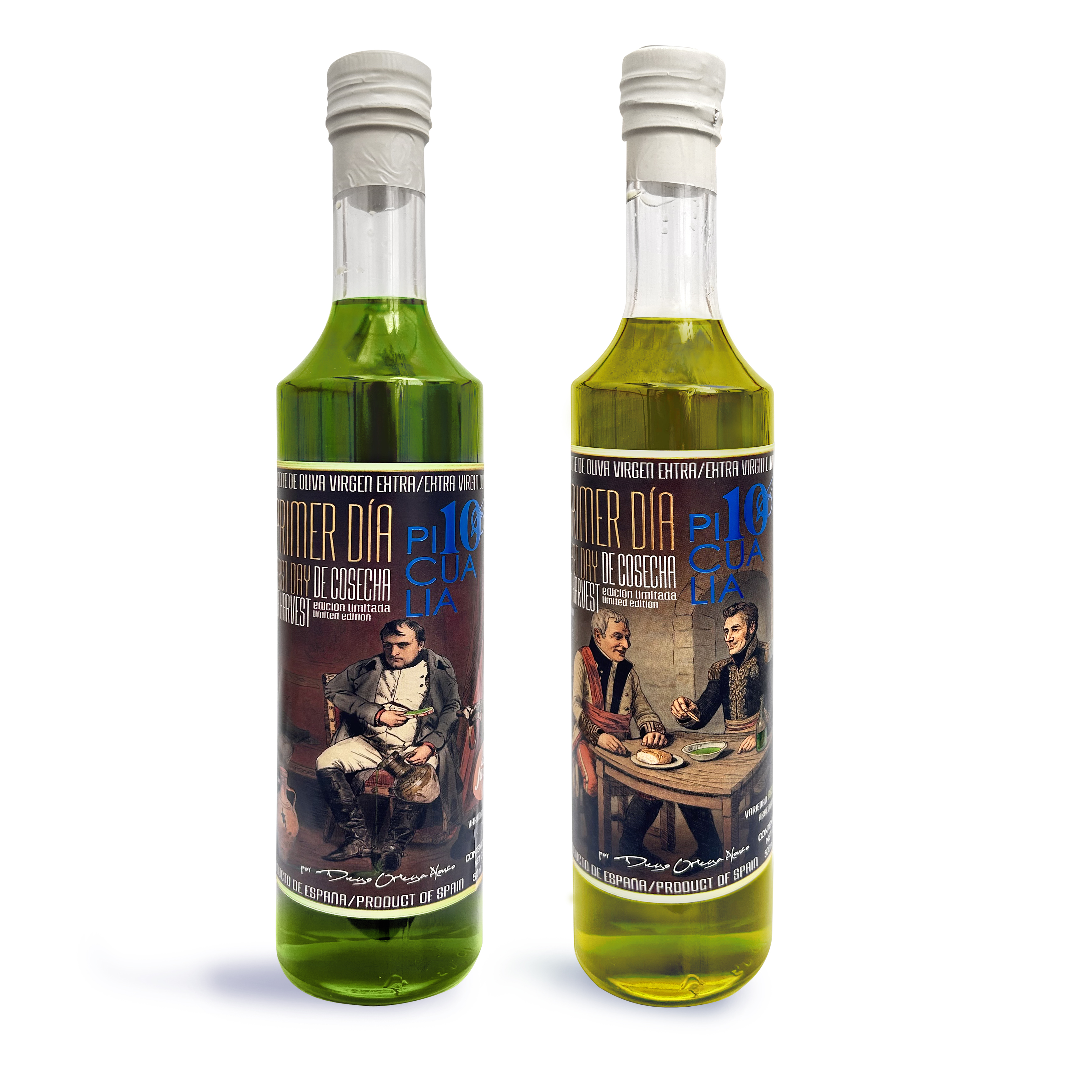 En la variedad Picual, la etiqueta reinterpretada del cuadro “La abdicación de Napoleón en Fontainebleau” (Delaroche, 1845) muestra al emperador derrotado, frente a un cántaro de aceite bailenense que simboliza la victoria del pueblo.